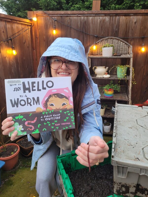 “You can often find me in my tiny patio garden saying hello to my plants, hummingbirds, bumblebees, and pet worms! These little wrigglers of mine live in recycled library book bins and eat my compost scraps.